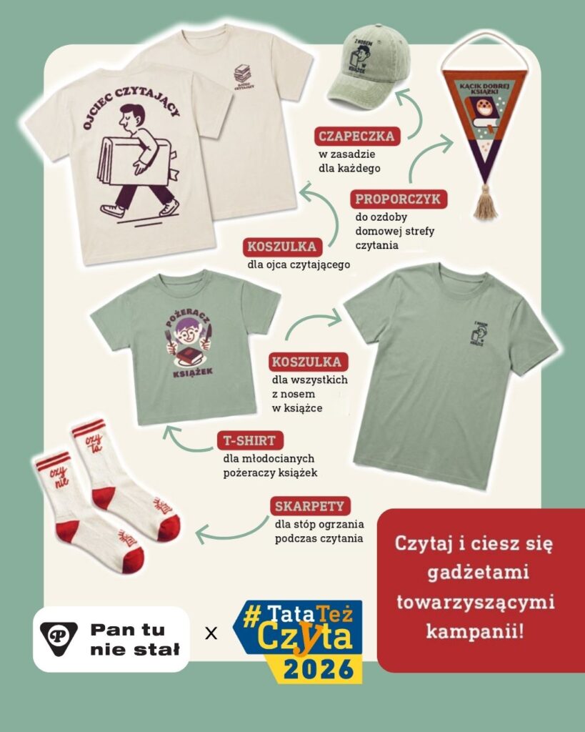 Koszulka Ojciec czytający dla taty i Pożeracz książek dla dziecka? A może proporczyk dla Waszej Wylęgarni moli książkowych? Bo przecież łączy nas czytanie, a czytający tata to powód do dumy. Wyraź to ubiorem. Wyjątkowa kolekcja od Pan Tu Nie Stał, która powstała w ramach współpracy przy kampanii #TataTeżCzyta to idealny pomysł na prezent!